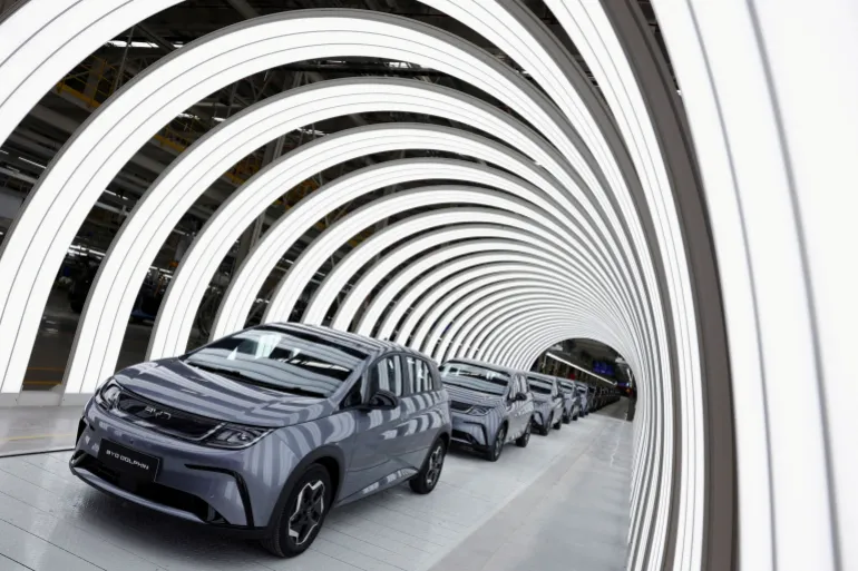 إنتاج مركبات الطاقة الجديدة من السيارات الكهربائية والهجينة وصل في الصين إلى 7.01 ملايين سيارة خلال العام (رويترز)